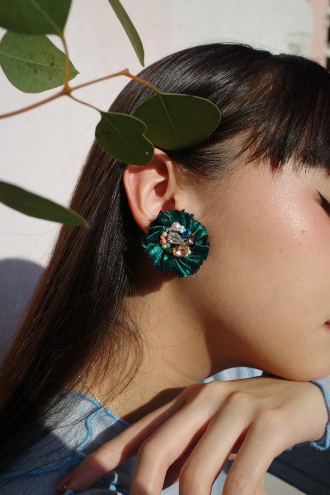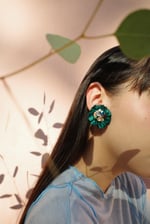 A rich jewel-green trim framing a bed of crystals and beads, paired with deep purple and soft peachy tones for a sophisticated, contrasting palette.